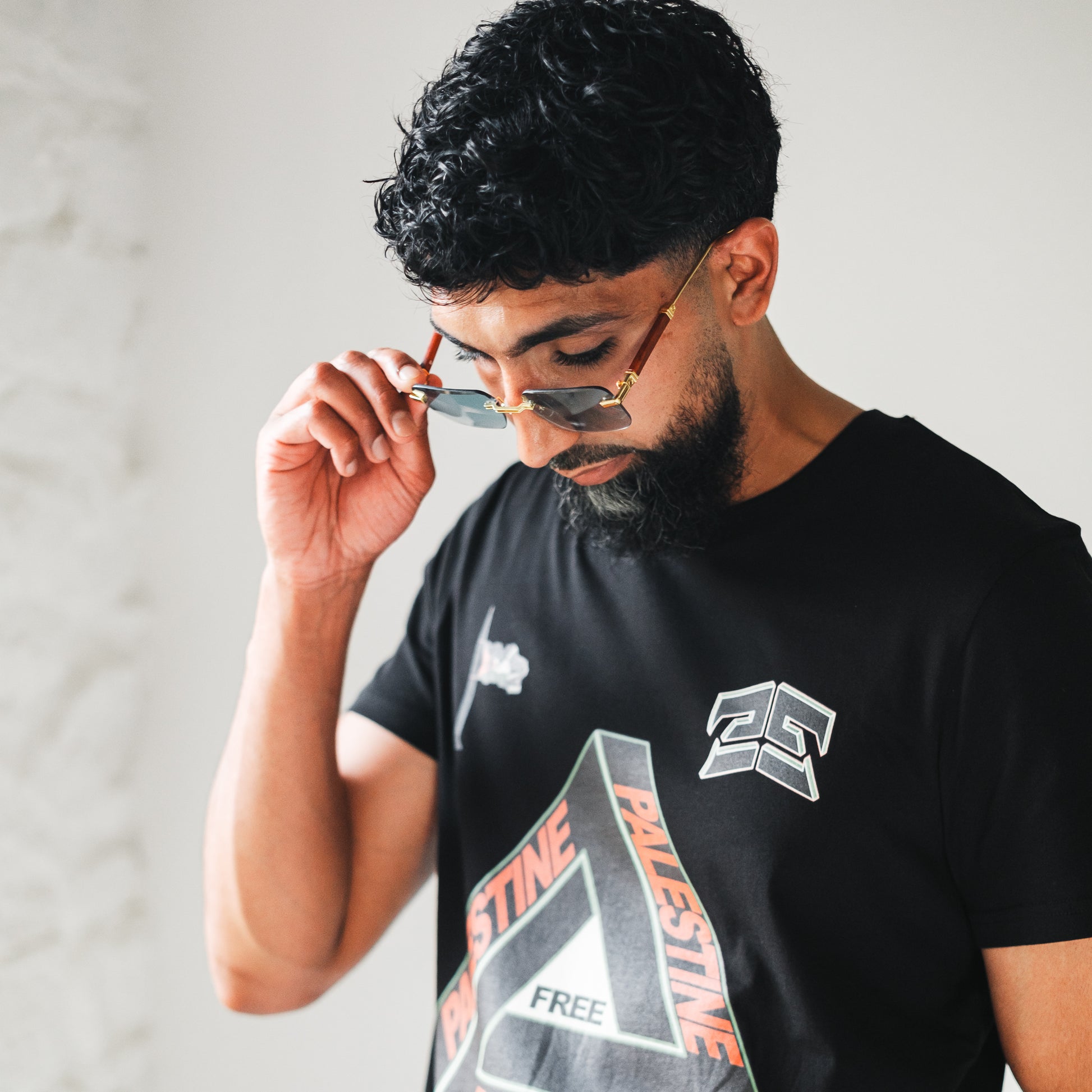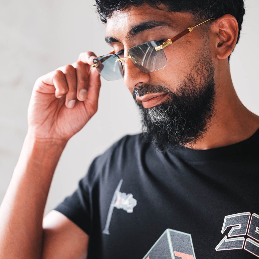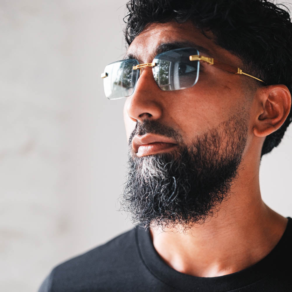 Featuring a rimless design and slick wood detailing on the arms, they blend natural texture with modern edge. A pop of colour adds personality, while the lightweight build ensures all-day comfort and standout style.