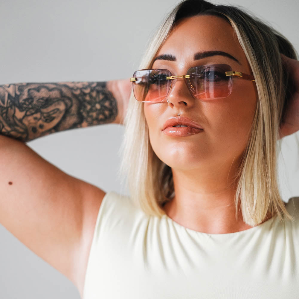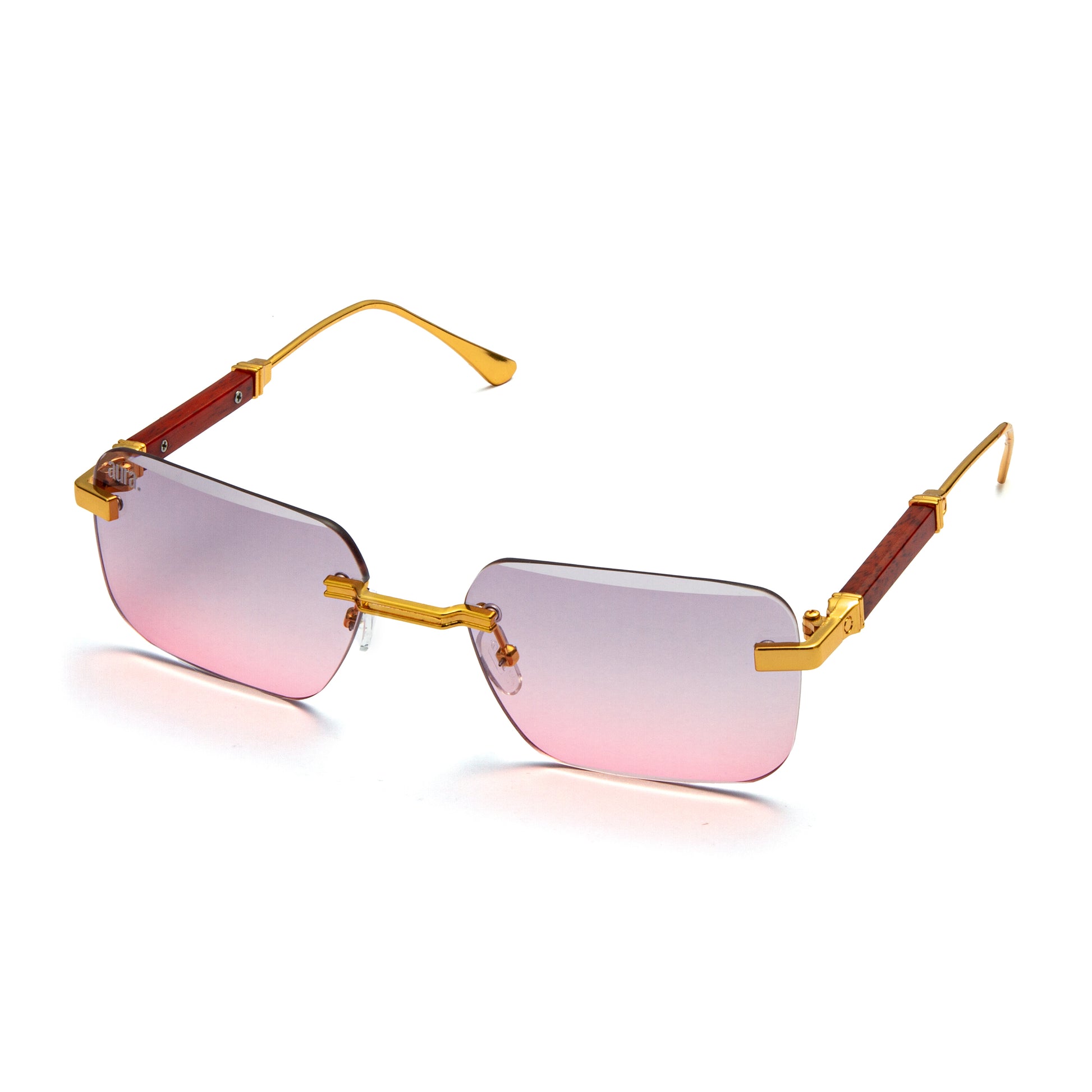 Featuring a rimless design and slick wood detailing on the arms, they blend natural texture with modern edge. A pop of colour adds personality, while the lightweight build ensures all-day comfort and standout style.